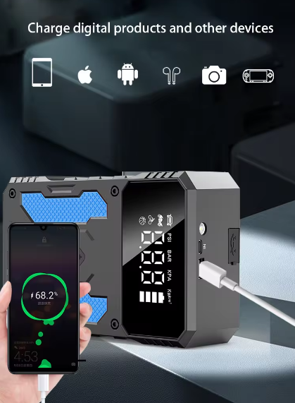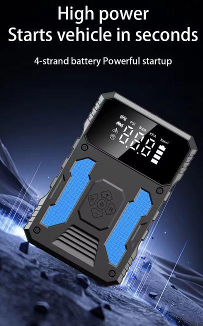 Be ready for anything with this 4-in-1 portable device that combines a car battery jump starter and tire inflator. Compact and powerful, it's the perfect ally for unexpected flat tires or dead batteries, ensuring you're never stranded.