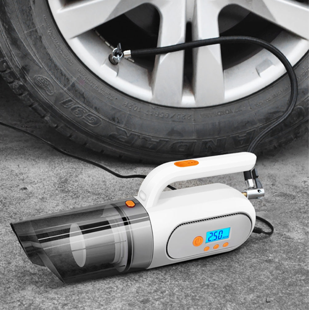 Introducing the iGADG 4 in 1 Car Toolkit - It is a multifunctional Vacuum & Digital Tyre Inflator designed to simplify your car cleaning and maintenance tasks. This compact unit combines a wired car vacuum cleaner, digital tyre inflator, tyre pressure gauge, and LED light, offering a comprehensive solution for keeping your car in top condition.